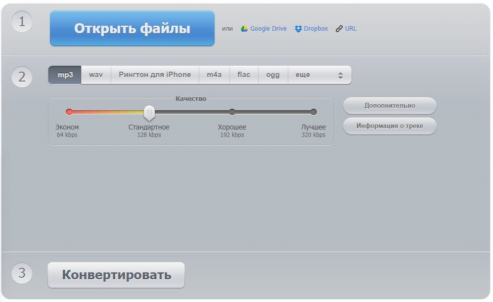 Сервис позволяет конвертировать музыку в форматы mp3, wav, iPhone ringtone, m4a, flac, ogg, mp2, amr.