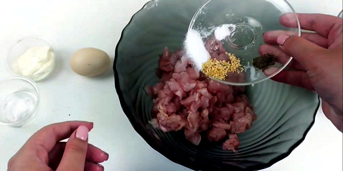 4) Соду и муку просеиваем в куриный фарш, вымешиваем до однородного состояния аккуратно вилкой