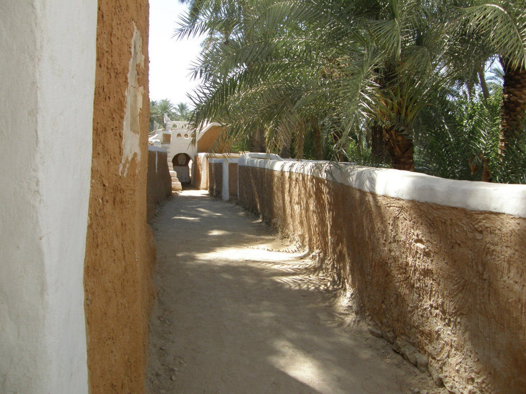 Старая часть города у арабов называется Медина, куда мы и направляемся дальше. Древний Гадамес снаружи и внутри обнесён 2-х метровой коричневой стеной с обязательным белым верхом, зелёные финиковые пальмы манят внутрь. Входим в ворота, и оказываемся в лабиринте узких улочек, где очень легко заблудиться. Верблюдов и лошадей сюда не приводили, оставляя их за городом, который был предназначен только для людей. Медина разделена на кварталы. Вид на мечеть Гадамеса.