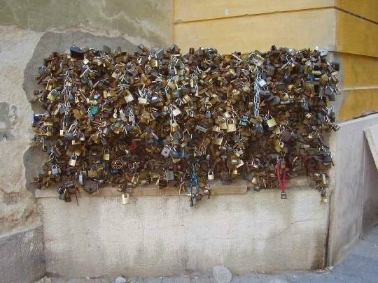 Традиция вешать замки на перила ограды на улице Януса Паннониуса существует с 80-х годов. Разумеется, есть много легенд, касающихся появлению здесь первых замков. По мнению некоторых старожилов города, первые замки были молчаливыми посланиями замужних дам своим любовникам о том, что пришло время тайного свидания. По другой версии, студенты университетских общежитий
