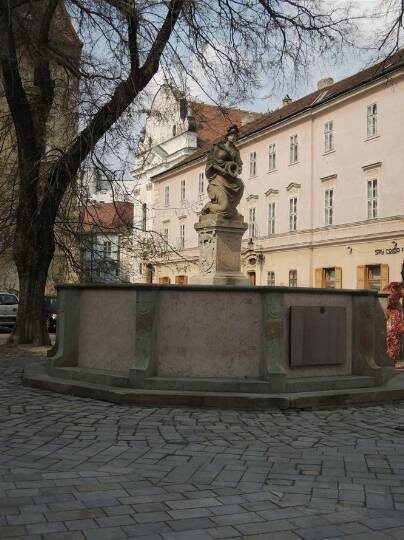 Фонтан Женщина с кувшином находится на Франтишканской площади. Он был основан как резервуар с питьевой водой в середине XVI столетия. Вода к старинному фонтану поступала по деревянным трубам, проложенным от источника в виноградниках. Согласно документам из городского архива, массивный постамент фонтана раньше был украшен фигурой льва и эмблемами Габсбургов,
