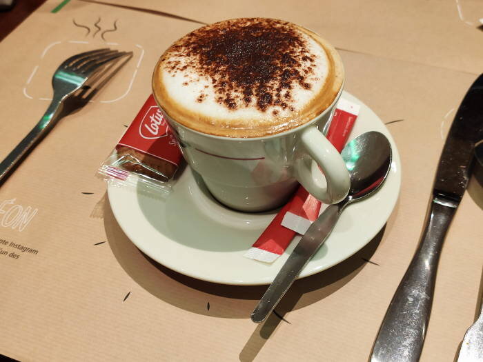 Тут он просто шикарный. Такой огромной шапки из пены я ещё нигде не встречала. Сантиметра 3-4 однородной плотной пенки. Сверху сладко-шоколадно. Снизу сам кофе. Пенку радостно съела ложкой.