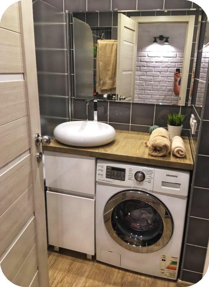 Раковина имеет необычную форму и выглядит стильно. Столешница достаточно большая и вместительная, что является явным плюсом. Под ней разместилась стиральная машинка и тумба, которая с одной стороны имеет свои исконные задачи, а с другой отлично прикрывает трубы раковины. Над раковиной же повесили достаточно широкое зеркало без рамок.
