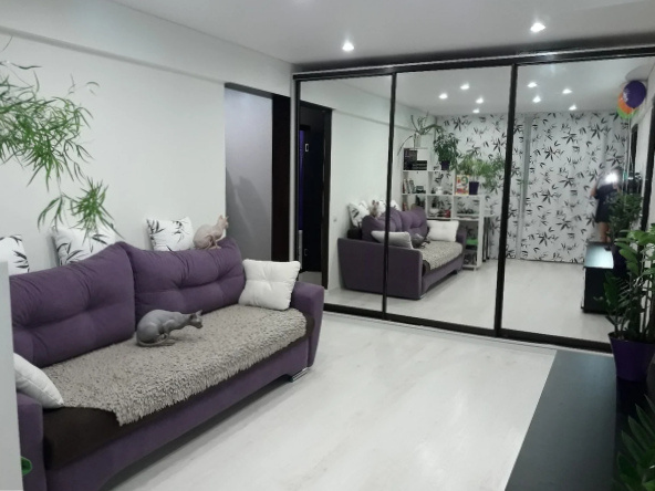 Хозяин поставил большой диван у правой стены, выбрав пыльно-фиолетовый цвет. Благодаря такому акцентному цвету комната сразу стала более ясной и интересной. Рядом с диваном стояла открытая полка, которую украшали различными мелочами и растениями (здесь уже должна была быть рука невесты).