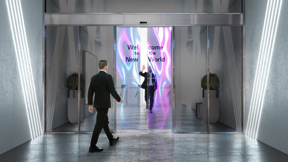 Потенциальные клиенты, входящие в торговые галереи, авиационные залы или офисные здания, скоро могут быть встречены рекламой и сообщениями, отображаемыми непосредственно на раздвижных дверях.