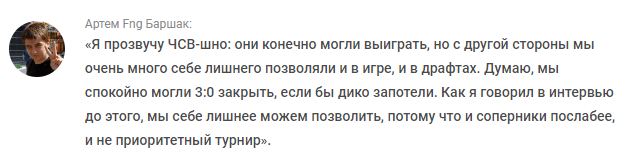 Киберспортсмен из Беларуси Артем Fng Баршак поделился мнением о матче Alliance против Gambit Esports в финале нижней сетки EPIC League Season 2 Division 2 по Dota 2. В послематчевом интервью студии RuHub саппорт отметил, что его коллектив не считает этот турнир приоритетным, поэтому в некоторых моментах больше себе позволяет.