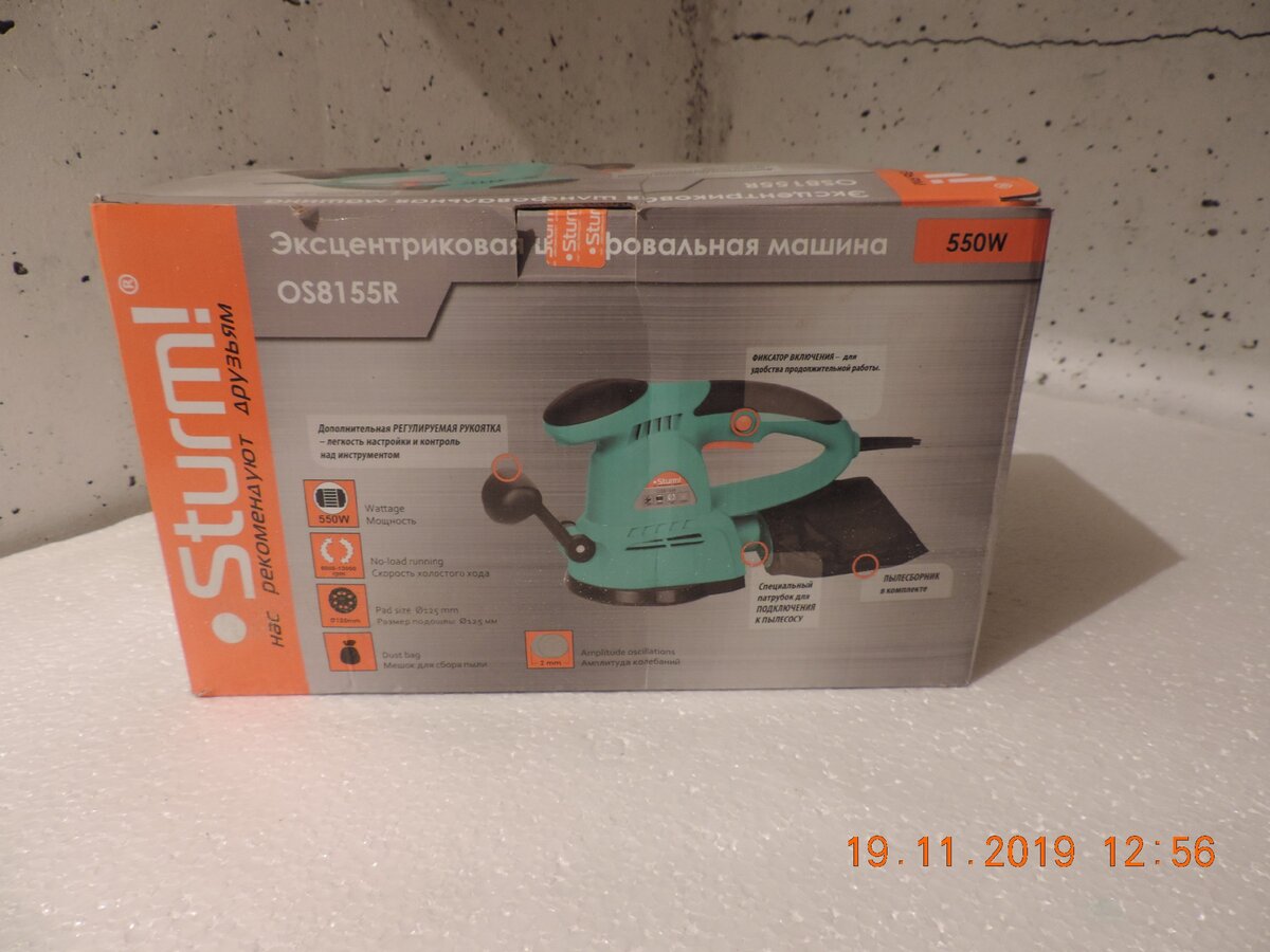 Покупал в специализированном магазине электроинструментов. При совершении покупки руководствовался отзывами, нужен был не дорогой и простой электроинструмент. Выбор остановил на бренде STURM модель OS8155R мощностью 550W. Машинка подходила мне