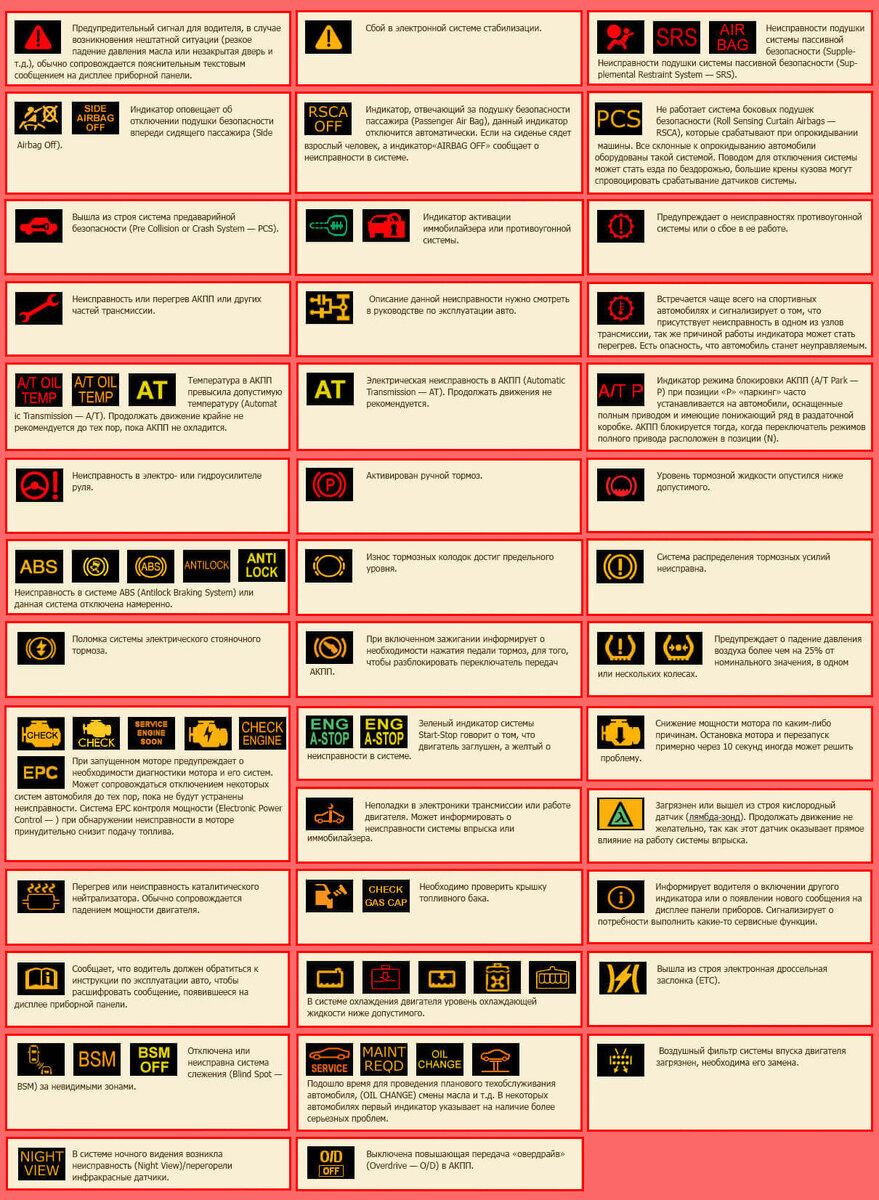 Данные знаки оповещают водителя о неисправности различных систем автомобиля. Понять значение таких значков не всегда удается интуитивно, поскольку не все автолюбители хорошо разбираются в машинах. К тому же, на разных машинах, индикаторы одного итого же значка могут отличаться. Но не стоит пугаться, не каждая лампочка на панели оповещает о критичной