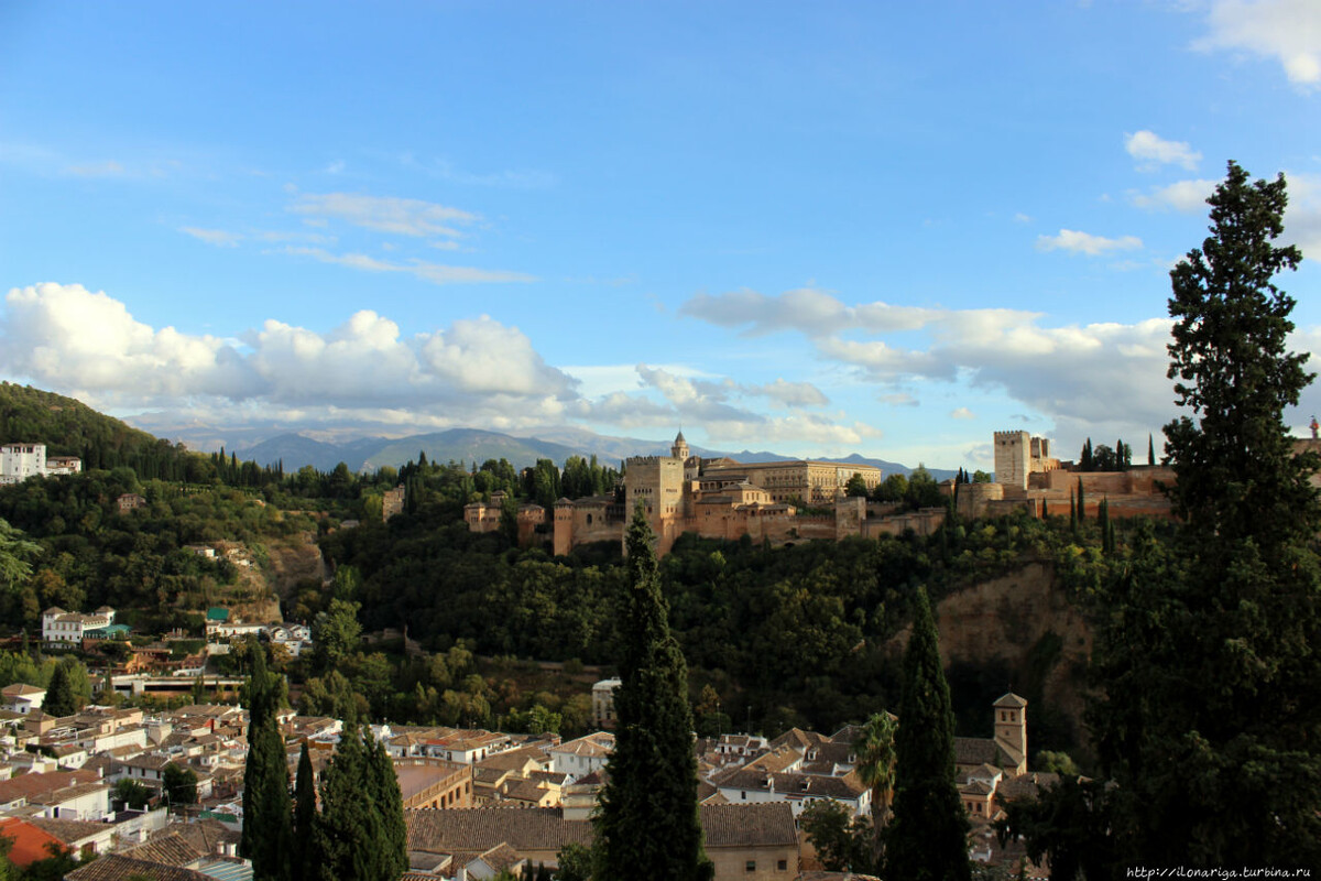 Именно поэтому, вечер первого дня мы решили посвятить созерцанию прекрасной Альгамбры с противоположной стороны. Лучше места, чем Альбайсин, для этой цели не найти. Завораживающий район, скажу я вам, дорогие друзья! Думаю, каждый путник, ноги которого забредут в лабиринт узких улочек этого древнего мавританского района, оценит ту красоту и торжественность вида, которая открывается перед всяк сюда входящим! Кажется, что крепость со всеми своими дворцами и башнями лежит прямо на ладонях!
