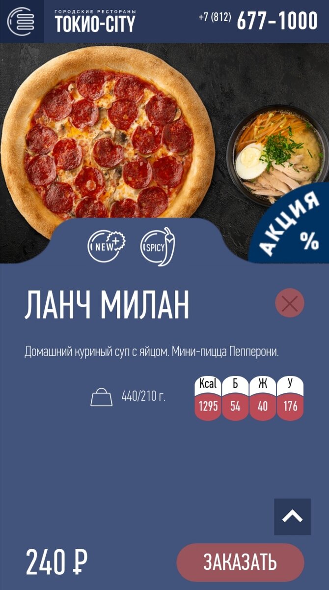 - К еде отношусь уважительно. Люблю есть вкусно и полезно. Одно из моих любимых блюд пицца Пепперони, суп куриный. Что я и заказала в Токио Сити. Стоимость - 240 р.