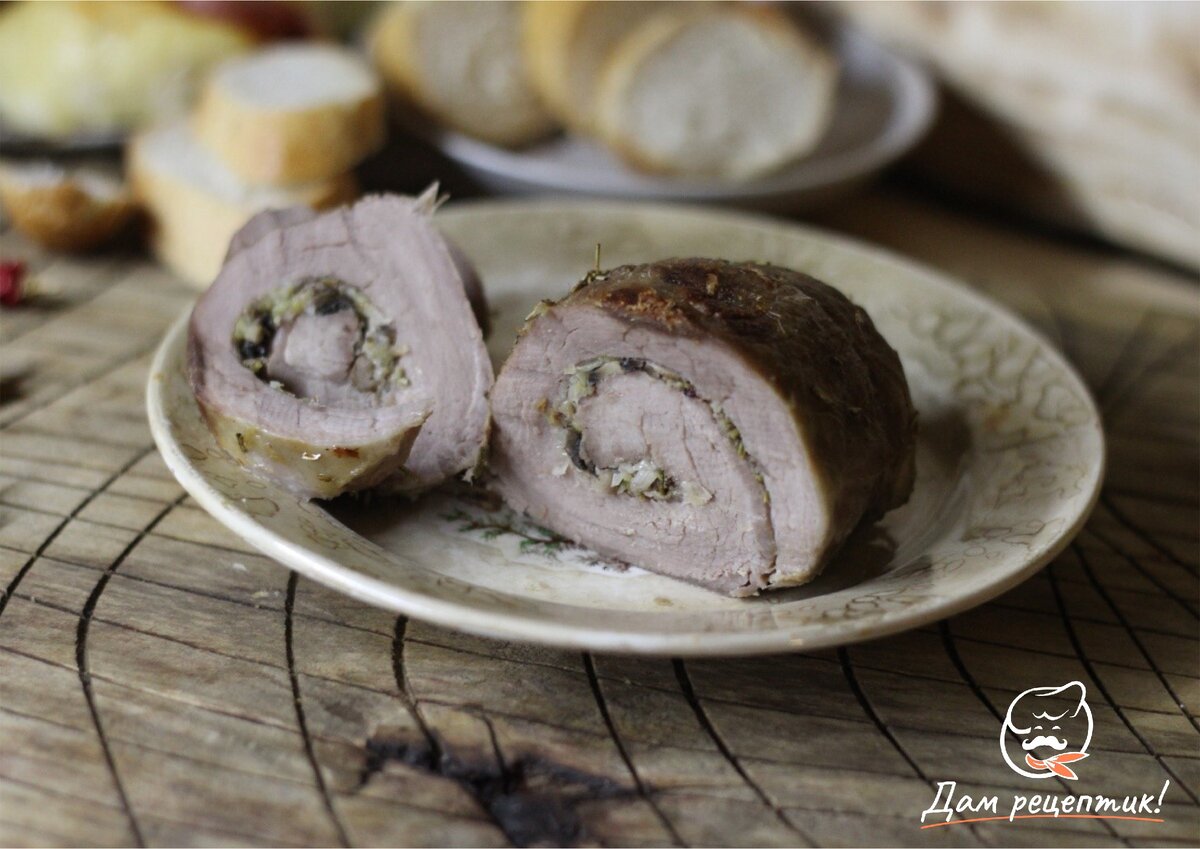 Выложить охлажденную начинку из порея и грибов на свинину. Свернуть мясо в плотный рулет.
