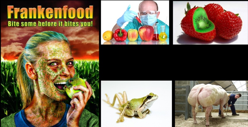 Вот в левом верхнем углу: не получают ГМО впрыскиванием чего-то в яблоко. Следующая картинка — это фотошоп. В нижнем углу — это паразиты вызывают такие аномалии в развитии у лягушек, плоские черви. А в правом нижнем углу — это не генномодифицированный бык, а бык полученный селекцией. То есть он натуральный эко/био всё что угодно.