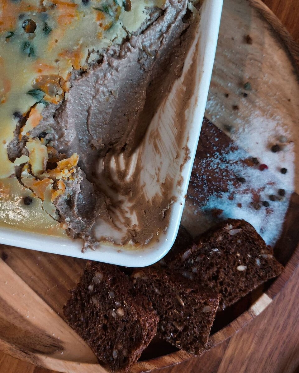 Смешиваем все ингредиенты в сотейнике, нагреваем до растапливания масла. И выливаем поверх паштета, когда он достигнет комнатной температуры.