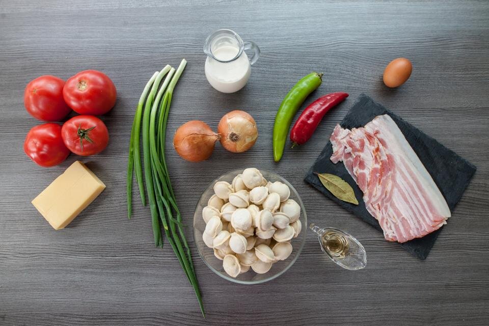 Пельмени 1 пачка 700г Помидоры 4 шт. Сыр 200г Чили перец зелёный 1 шт. Чили перец красный ½ шт. Лук репчатый 2 шт. Лук зелёный 4 пёрышка Сливки 22% 300 мл Бекон 7 слайсов Лавровый лист 1 шт. Яйцо 1 шт. Сахар 1 ст. ложка Яблочный уксус 1 ст. ложка Растительное масло 20 мл Соль Перец