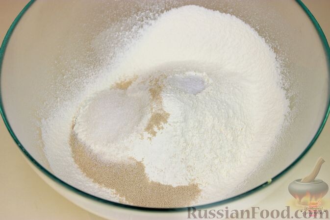 Просеиваем муку, добавляем сахар, соль и дрожжи. Перемешиваем.