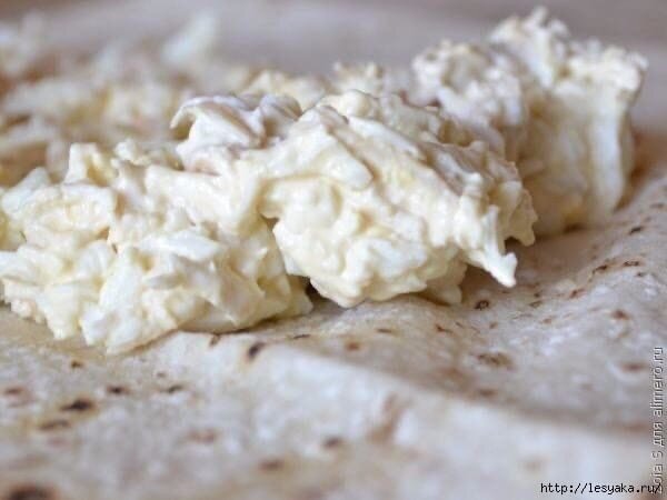 4. Чеснок почистить, помыть, мелко порезать. Добавить к подготовленным продуктам соевый соус и майонез. Перемешать. Полученную массу нанести равномерно на лаваш.