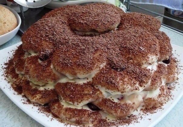 Для крема смешать венчиком сметану и сахар. Я бы вам не советовала весь стакан сахара добавлять – на мой вкус слишком сладковато, я меньше добавляю, но тут все по личным предпочтениям. Взбивать не требуется, просто размешать до растворения сахара. Далее обмакивать лепешечки в крем, выкладывать слоями на блюдо. Сверху посыпать шоколадной стружкой.