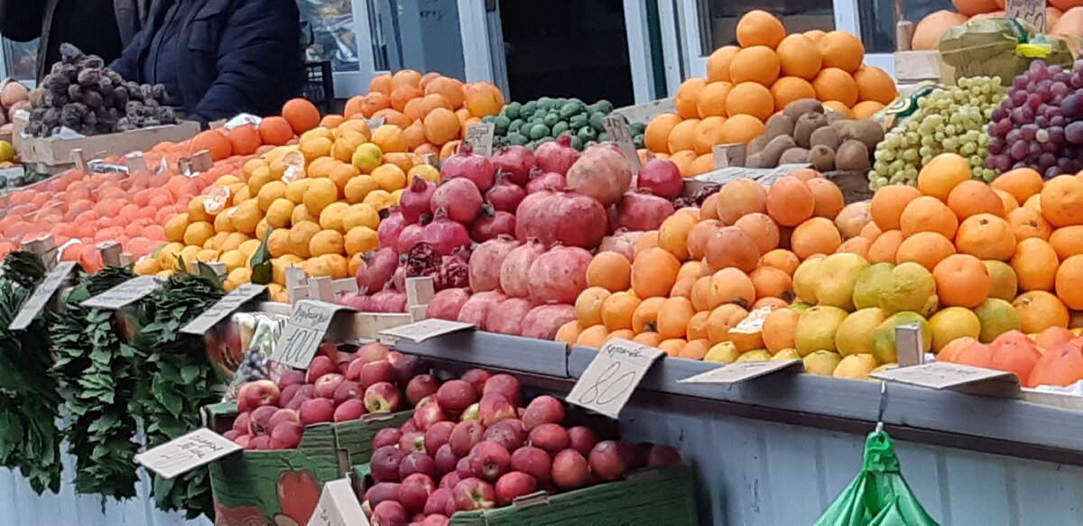 Нельзя сказать, что ассортимент как-то отличается от рынков в других городах. Но, это только по наименованию. По качеству продукции – мне все очень понравилось. Если не считать тропических фруктов, то все, можно сказать, местное – из ближайших сел и республик. Мандарины – из Абхазии и Грузии, но это тоже недалеко. Абсолютно все можно попробовать, не боясь отравиться обработанным воском или другими препаратами для сохранения фруктов. Цены: