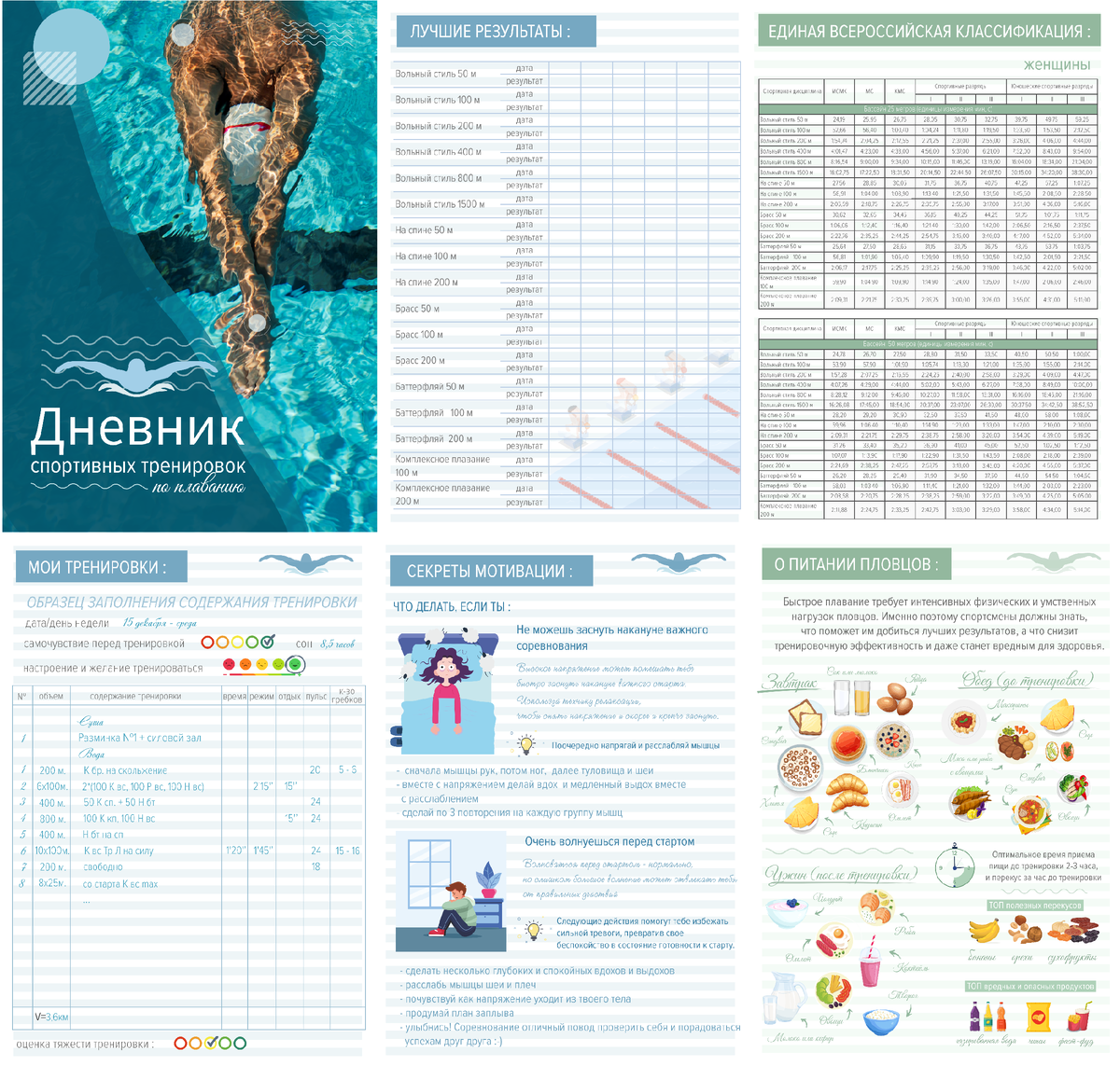 Спортивный дневник по плаванию для ребят спортивной школы я решила сделать сама. Услышала обсуждения родителей(группы дочки по плаванию) в чате по поводу подарков детям на Новый год. Они хотели заказать дневники, которые, на мой взгляд, можно было бы дополнить нужной информацией. И предложила разработать шаблон самой (совместно с тренером).