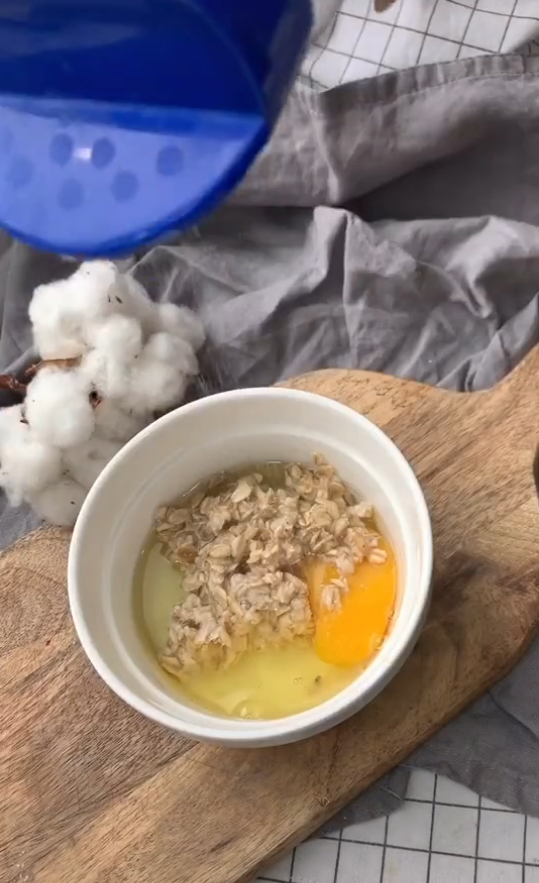 Овсянку 20 грамм замачиваем кипятком, на пару минут.