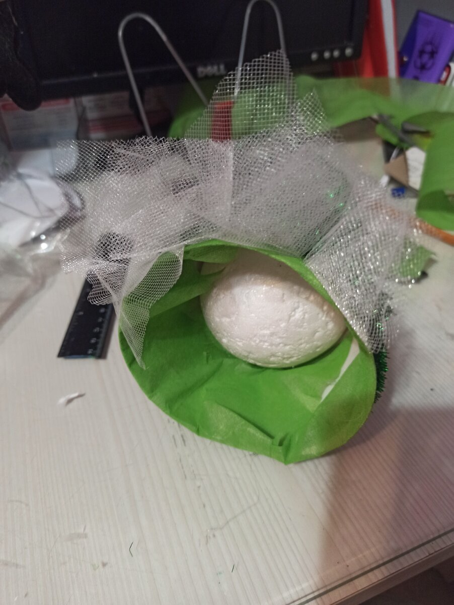 Для начала мы сделали конус из картона обклеили зеленой бумагой ,снизу внутри конуса приклеили шар из пенопласта для того чтобы воткнуть туда ножки-карандаши. Вот как это выглядело 👇
