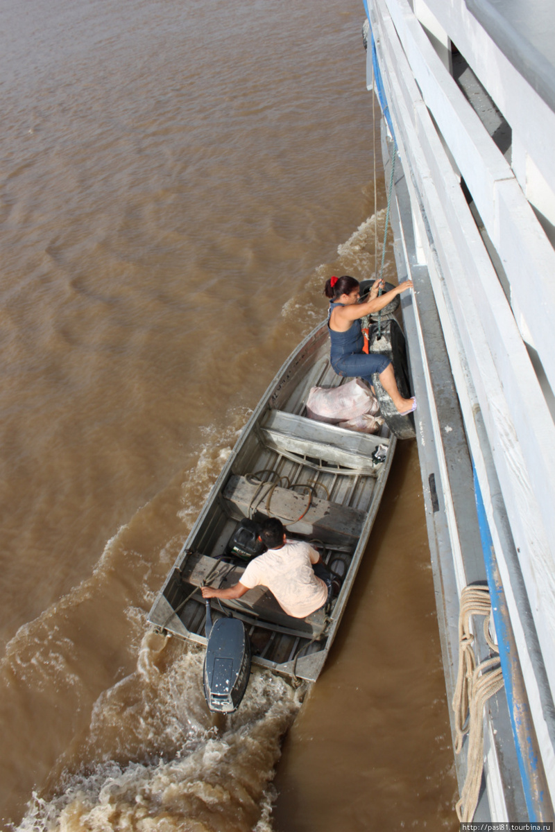Судно идет практически без остановок. В мелкие деревушки груз и пассажиров доставляют на моторной лодке, которая обычно висит за бортом. В более крупных городах причаливаем на несколько минут. К пристани или же к борту другого судна. Возникает оживление и суета. Быстро запрыгивают на борт новые пассажиры, заносят груз. Такие остановки желанны — вносят разнообразие в ленивое созерцание и ничего не делание. Иногда стыкуемся с другими баржами прямо по середине реки. Такие события не часты — раза 3-4 в сутки.