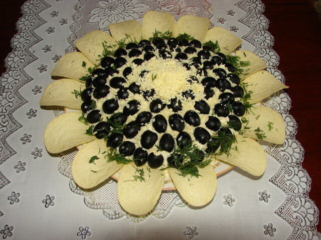 Начинаем собирать «Подсолнух». На плоскую тарелку выкладываем куриное мясо, делаем сеточку из майонеза. Следующий слой – грибы с луком. Их можно предварительно перемешать, если вы жарили отдельно. Опять сеточка майонеза. Затем белки –майонез, сыр –майонез. Последний слой – желтки. Немного оставьте для украшения серединки салата. На них выкладываем по кругу маслины. В центре немного посыпаем желтком, как у меня на фото. Далее чипсами по кругу выкладываем листочки подсолнуха.