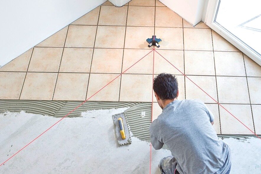 Первым делом в начале процесса облицовки поверхность пола необходимо подготовить: удалить грязь, пыль, мусор. Также стоит удалить гипс с поверхности пола, так как он может привести к вспучиванию покрытия. Удаляются так же следы от масла, а дальше необходимо хорошо вымыть поверхность пола.