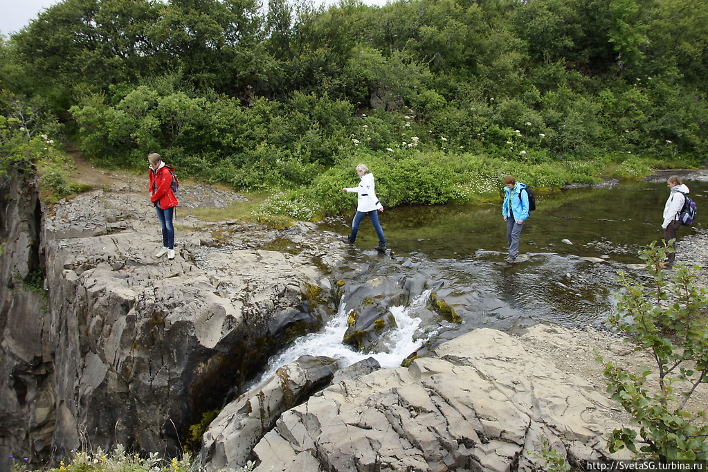 Свартифосс (исл. Svartifoss) — чёрный водопад или тёмное падение, находится в Национальном парке Скафтафетль (площадь около 4807 км², этот парк второй по величине в Исландии). Идем к водопаду.По пути встретили еще один водопад. Он там, внизу. Подойти страшно — желающие посмотреть залегли.Особо умные обошли опасное место и полюбовались на него