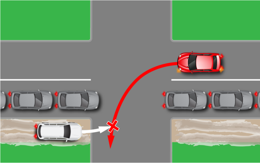 В то же время по обочине едет белый автомобиль, которого не видно из-за плотного ряда стоящих в заторе автомобилей. При столкновении белого и красного авто кто будет виноват в аварии?