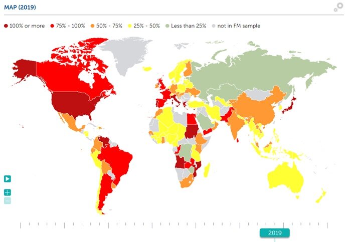 На заглавной иллюстрации этой статьи карта долга стран мира по результатам 2019 года по данным МВФ. Чем краснее цвет, тем больше долг. Серо-зеленый цвет – мало долга. Недавняя история российского госдолга в процентах от ВВП выглядит следующим образом: