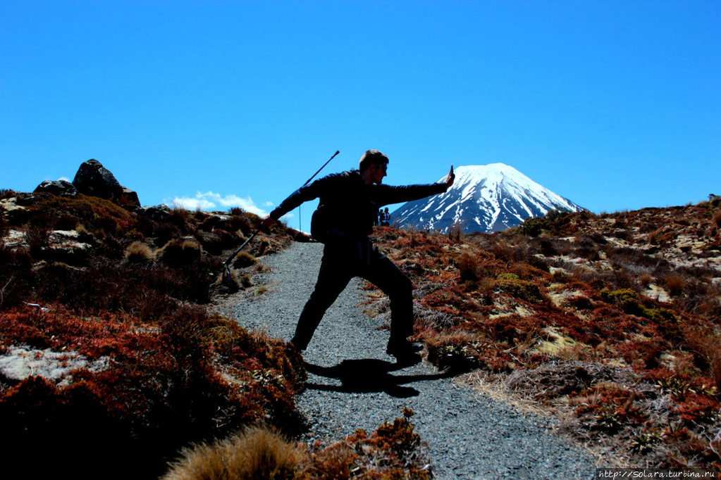 Шоколадные батончики разложены по доступным карманам. Идти весело и ненапряжно. Совсем не холодно. Круг Тонгариро (Tongariro Northern Circuit) — это 50 километров вокруг горы Нгарухое (mt Ngauruhoe). Это та самая гора, куда Фродо нес Кольцо в легендарном фильме Питера Джексона. Тысячи туристов со всего света обходят эту гору ежегодно. Самая популярная часть — это 15 километровый Тонгариро Кроссинг (Тongariro Crossing) — поход через действующие вулканы Тонгариро. Занимает он всего день и доступен почти каждому, у кого есть ноги. Сезон начинается 24 октября. И как раз мы ступили на тропу владений Темного Властелина солнечным утром 25-го. Тут, в низинах, совсем не чувствуется морозный воздух. Разноцветные мхи переливаются на солнце, навстречу нам возвращаются туристы (мы решили пройти этот круг против часовой стрелки).