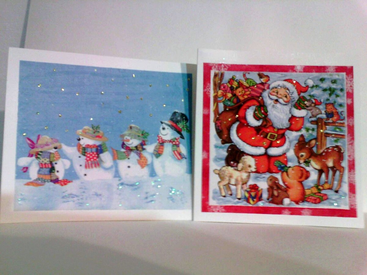 Сегодня речь пойдет об открытках. Я - достаточно современный человек, и прекрасно понимаю, что сейчас отправить красочную открытку в Вайбере или Одноклассниках своим друзьям во всем мире гораздо проще и быстрее, чем, как раньше, сходить в газетный киоск, выбрать, купить, подписать и отправить почтой задолго до заветного дня. Но, как же я радовалась в детстве, когда получала открытки от родных! Почти все они хранятся у меня в домашнем архиве. И как-то раз, пересматривая его вместе с дочкой, мы решили возродить эту традицию, и вместе с Татьяной Александровной, преподавателем Марины перед на одним из Новых годов приготовили целую серию открыток ручной работы в технике декупаж.