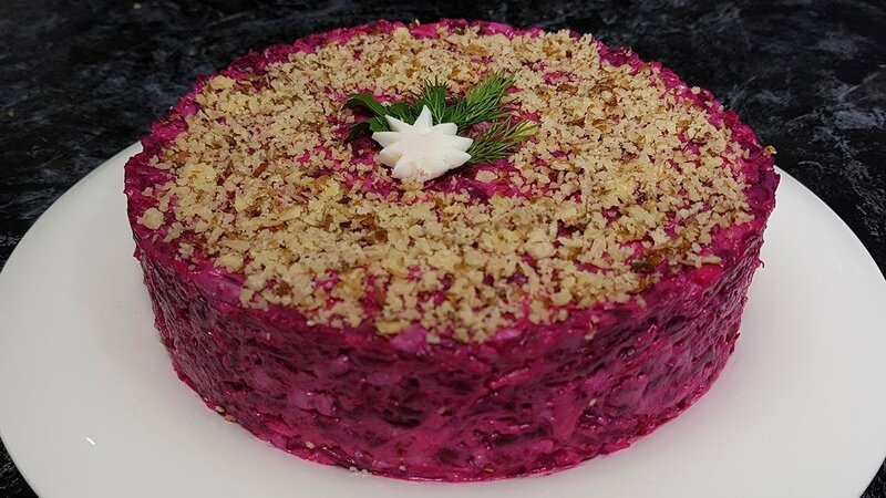 Сверху салат можно украсить толчеными грецкими орехами, изюмом и черносливом. Но это по желанию. Можно вообще ничем не украшать, либо просто положить в центр веточку зелени.