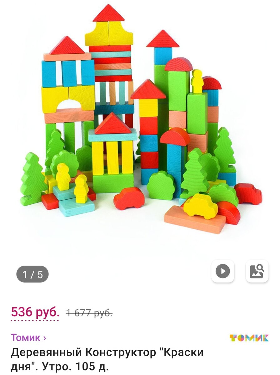 Для малышей можно найти чудесные деревянные конструкторы Томик, из 105 деталей «Утро» со скидкой будет стоить всего 536 рублей.