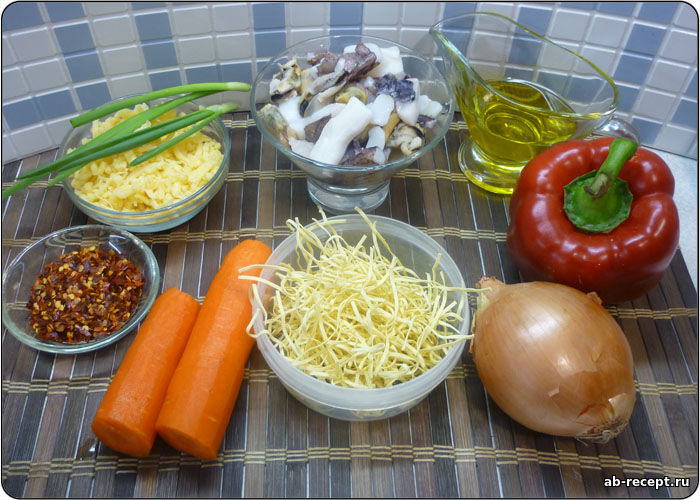 3. Морепродукты обжариваем минут 10 до тех пор, пока не испарится лишняя влага, затем добавляем лук, перец и морковь. Солим и тушим до готовности лука и моркови.
