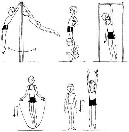 Прыжки в высоту или на скалке. Прыжки направлены на растяжку дела. Благодаря прыжкам вытягивается позвоночник, следовательно увеличивается рост. Кажды раз нужно стараться допрыгнуть как можно выше- движения должны быть устремлены вверх.