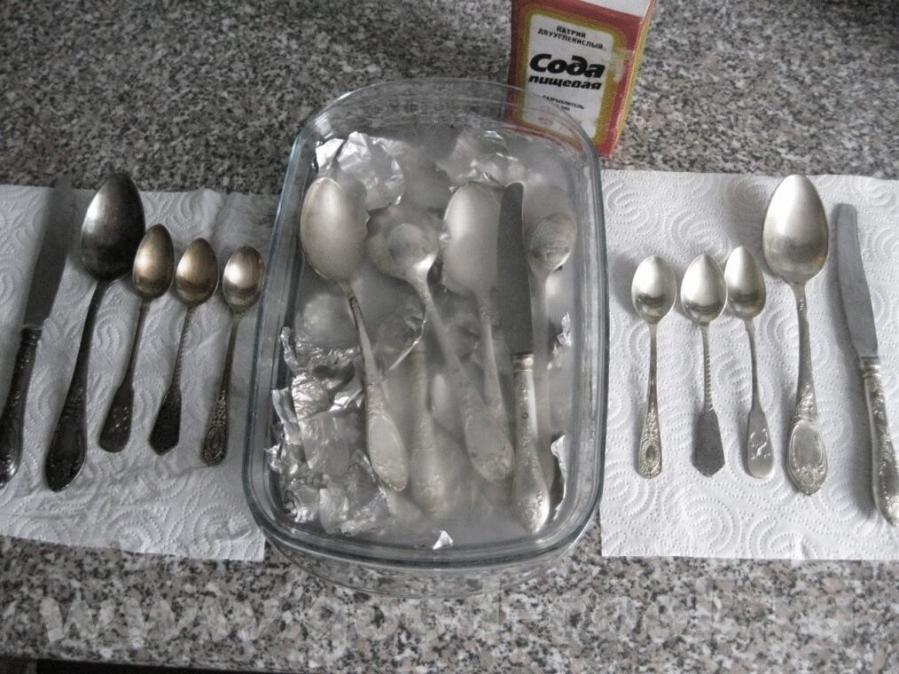 Более оригинальный способ – это налить пару стаканов воды в алюминиевую кастрюлю, добавить туда 1 столовую ложку соды и 1 столовую ложку соли, довести раствор до кипения и положить туда серебряные изделия на 3-5 минут. После этого приборы вымыть и вытереть полотенцем. Серебро станет блестящим и светлым.