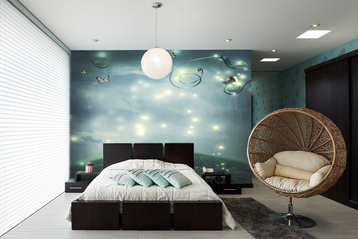 Так, в спальне место натяжной стены — однозначно в изголовье кровати. Там нет выключателей и розеток, риск повреждения минимален и, в большинстве случаев, эта стена первой бросается в глаза при входе в спальню.