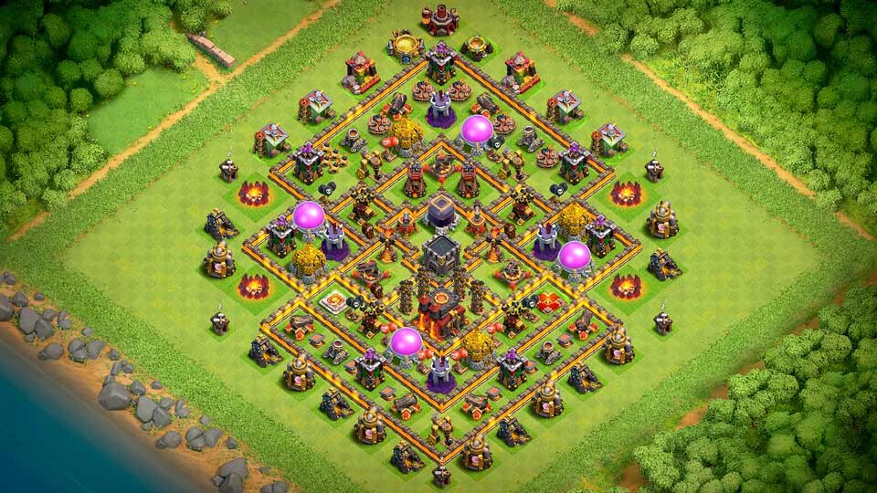 Эта круговая (кольцевая) база отлично подходит для защиты ваших ресурсов. Все хранилища расположены во втором кольце стен, а хранилище дарка и Ратуша находятся в последнем отсеке в центре базы, окруженном четырьмя Потайными тесла и двумя Адскими башнями.