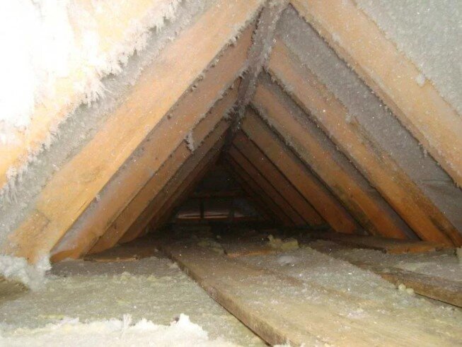 Со временем влага проходит сквозь утеплитель и поднимается вверх, под конёк. Там она сталкивается с ледяным воздухом, и выпадает роса.