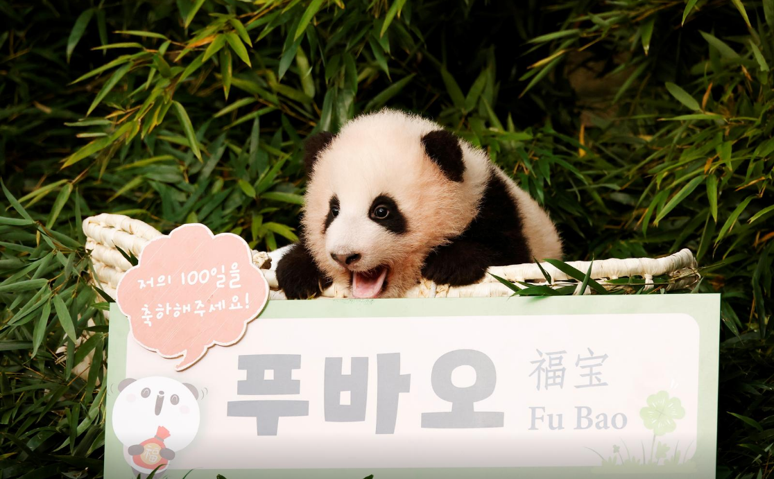 Первая панда, родившаяся в Южной Корее, была представлена группе счастливых детей и репортеров в среду и получила имя-Фу Бао, что означает счастливое сокровище.