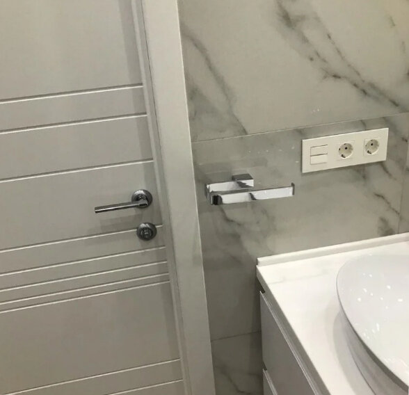Хозяева выбрали светлую цветовую гамму, отдав предпочтение сочетанию серого и белого цветов. Дверь выбрана с