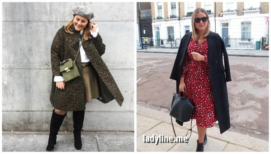 Миди платье ярко-красного цвета в дерзкий анималистический принт стилисты рекомендуют пышным красоткам носить с базовым черным пальто, остроносыми ботильонами и базовой сумкой с деревянной ручкой круглой формы.