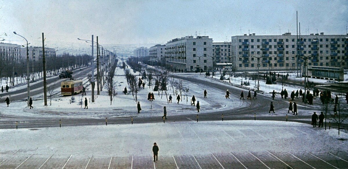 Как просторно! Как много воздуха! Ни тебе скопищ киосков и павильонов, ни верениц машин, деревца маленькие - всё просматривается насквозь. Начало 70-х прошлого века. Со ступенек новенького кинотеатра "Юбилейный" снято. Многие это, скорее всего, определили без труда. Самый центр тогдашнего Красноармейска приканального. Справа видна большая районная доска почёта. Как и положено - доска почёта в