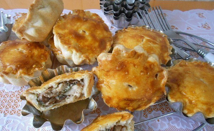 7.Накрыть формочки маленькими кружками, края теста плотно защипать.Желток взбить и смазать поверхность мини-туртов. Кончиком ножа сделать небольшие отверстия в середине туртов.