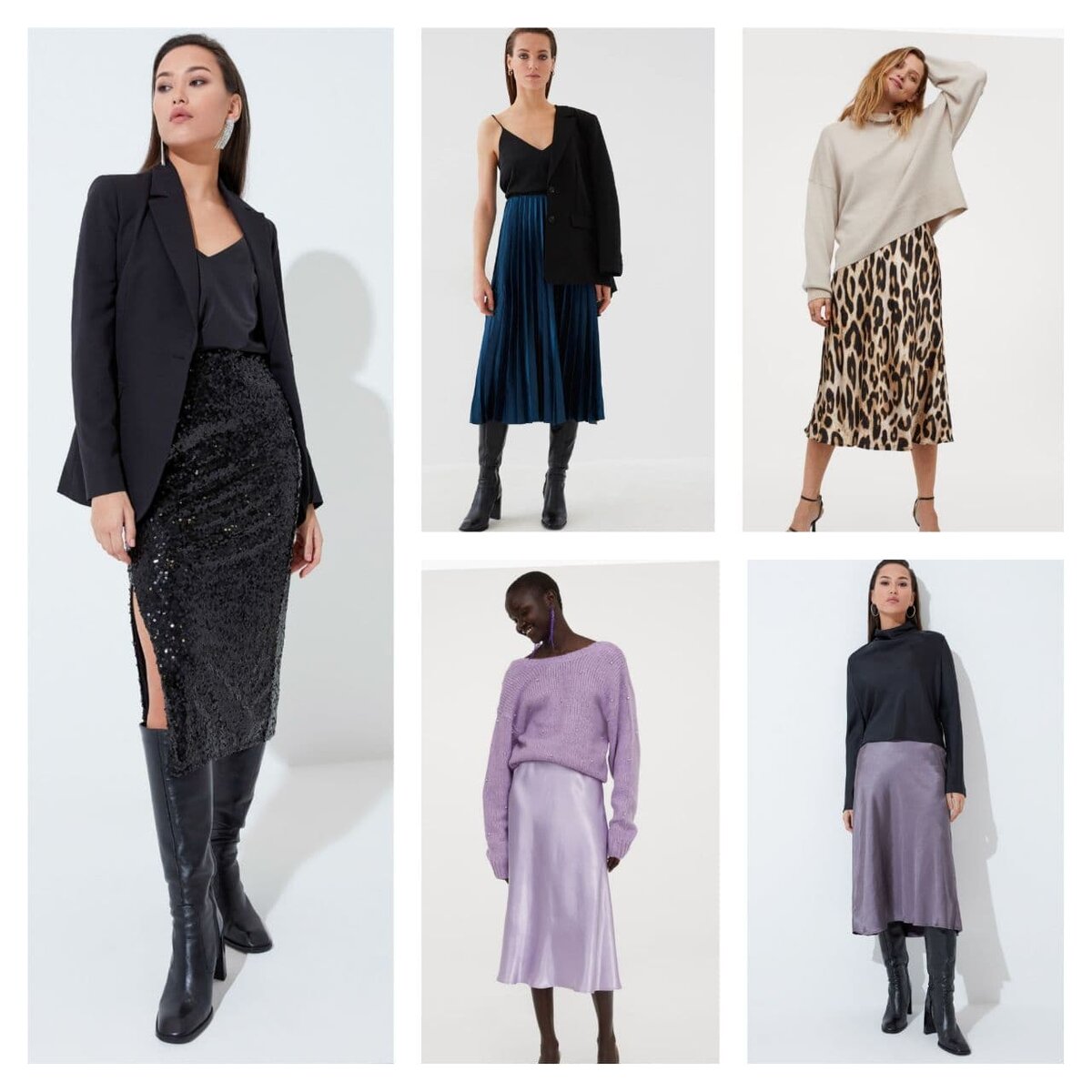 Юбка в пайетку появилась тут не случайно, она стала уже частью обычной жизни, ее можно носить летом с кедами, футболкой и джинсовкой, и со свитером с сапогами - зимой. Все остальные вещи максимально простые на слайде и чаще всего присутствуют в гардеробах (даже если не в таком исполнении, но юбки, свитера и топы точно есть). Проявив немного фантазии, образ может быть очень праздничным. Яркий макияж, укладка (например: сделать эффект мокрых волос и зачесать назад; высокий хвост или небрежные локоны), можно добавить крупные аксессуары (браслет или несколько браслетов; длинную нить жемчуга, только не скручивать ее в несколько слоев, а именно длинную; акцентные серьги; цепи, чокеры на шею).
