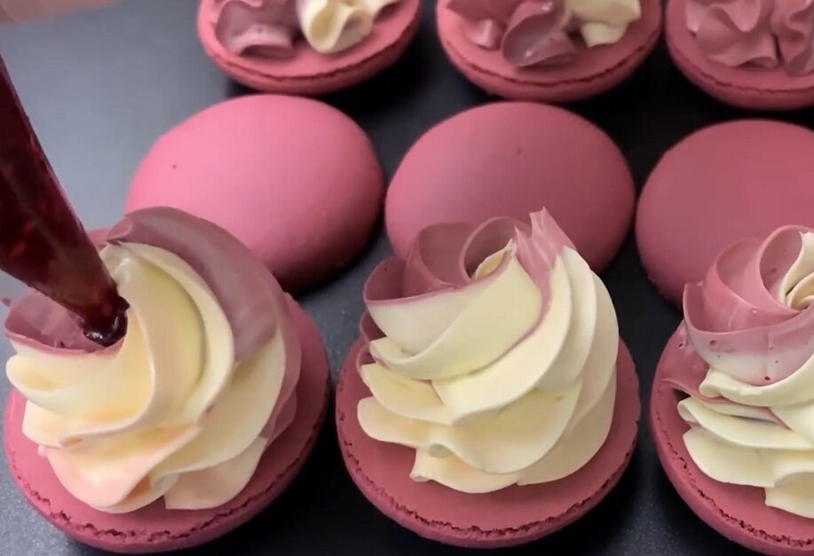 В завершении охлаждаем крем, переливаем в большой отсадочный мешок конусообразной формы, щедро смазываем макароны (macaron), затем выкладываем в середину изделий любимое варенье.