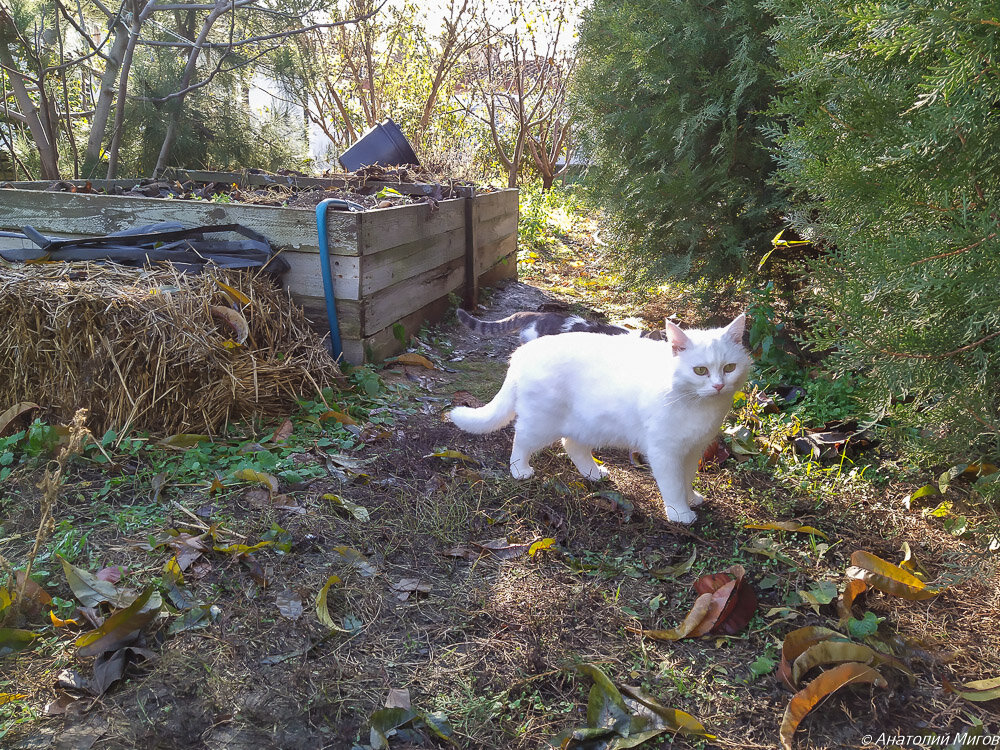 Нашим кошкам теплая зима тоже нравится. В холода их из дома не выгонишь. Греются на батарее или лежат в ванной на теплом полу. А в теплые дни бродят за мной по саду или носятся друг за дружкой.