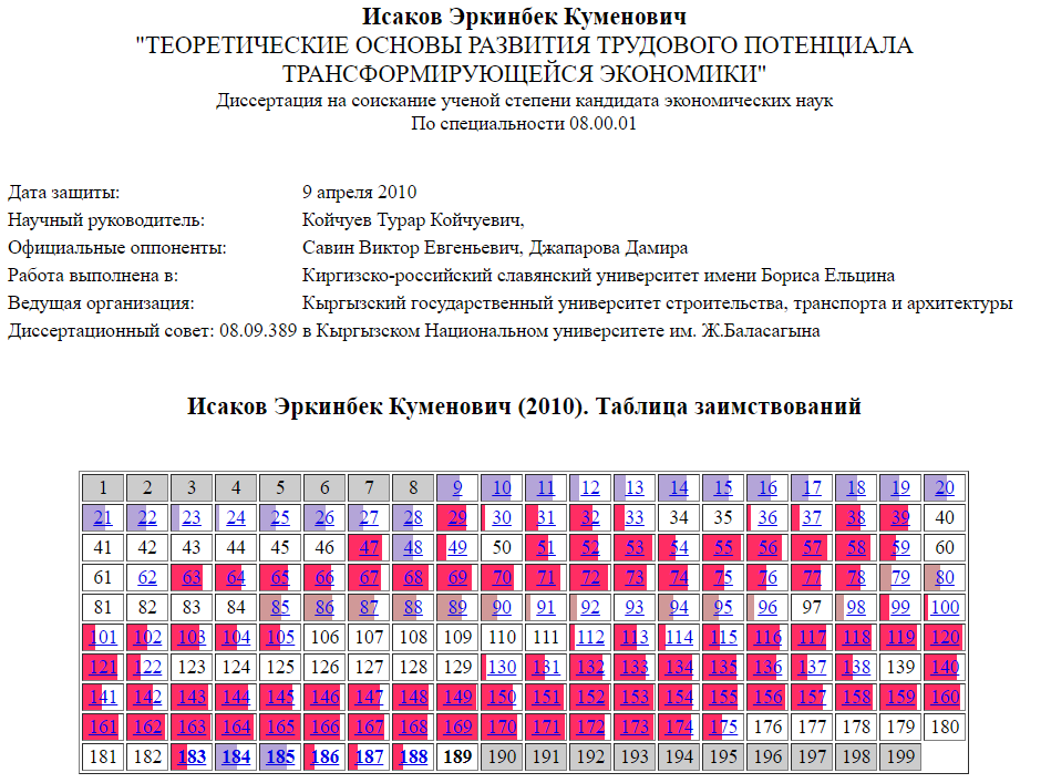 В работе Исакова на всем протяжении заимствований из Магомедова имеет место профанация научного исследования: "Россия" и "Дагестан" заменяются на "Кыргызскую республику". В ряде случаев (например, стр. 64) к Кыргызской республике отнесены и численные данные, полученные изначально для Дагестана. Экспертиза с кликабельными клетками ___________________ Сообщество Диссернет напоминает, что никакая проведенная им экспертиза не может считаться окончательной. Экспертиза носит предположительный (вероятностный) характер и основана на имеющемся в наличии объеме информации, полученной исключительно из открытых источников. Эксперты готовы в любой момент возобновить исследования в случае обнаружения вновь открывшихся обстоятельств. Любая дополнительная информация, могущая повлиять на экспертизу, будет с благодарностью принята и проверена в кратчайшие сроки, а результаты такой дополнительной проверки (мнения экспертов Диссернета) будут немедленно обнародованы. Просим любую информацию, имеющую отнош